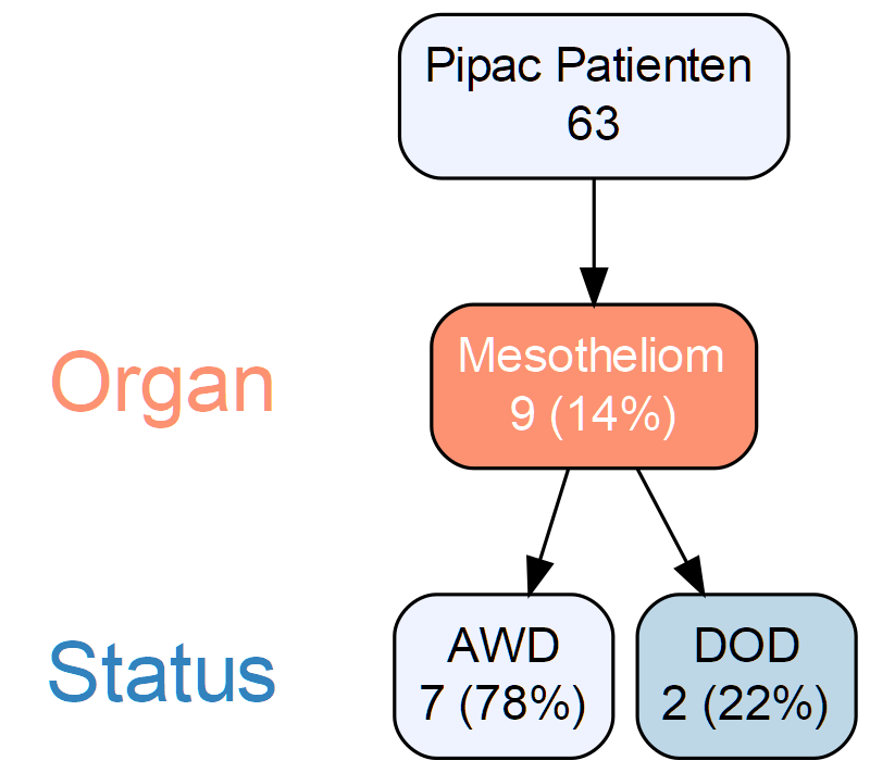 Therapieoptionen: Die hypertherme intraperitoneale Chemotherapie (HIPEC) ist bei resektabler Erkrankung die 1. Methode, die zur Anwendung kommt. Hier konnten 5-Jahres Gesamtüberlebensraten von über 65% nachgewiesen werden. Bei nicht resektablen und somit fortgeschrittenen Erkrankungen stellt die palliative PIPAC (pressurized intraperitoneal aerosol chemotherapy) synchron mit der systemischen Therapie eine Option dar. Das 2-Jahres Gesamtüberleben von 9 in Salzburg behandelten Patient/Innen mit einem nicht resektablen peritonealen Mesotheliom beträgt aktuell 67%.